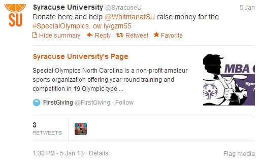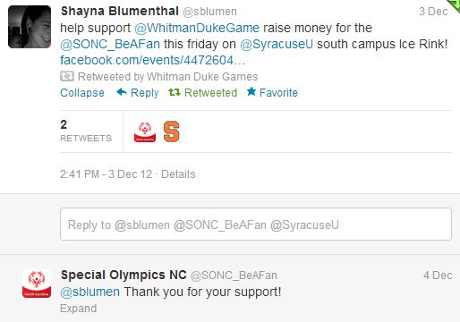 I started my efforts by writing an email to the school’s daily newspaper, The Daily Orange, telling them of our efforts, and of the launch of our social media platforms. Additionally, every tweet mentioned Syracuse University or the Whitman School, and all used the hashtag Special Olympics or DukeMBAGames. My goal was that anyone who followed that hashtag (mostly the Special Olympics, or any of the state Special Olympic boards), would see the tweets, and start following our handle, and retweet us.