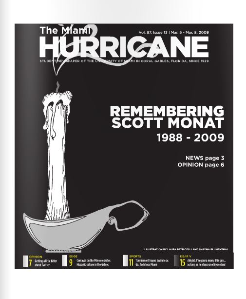 The Miami Hurricane Newspaper, March 2009, Coral Gables, Fl. Columbia Scholastic Press Association Gold Circle Award, Page One Design First Place, Hand Drawn Illustration Third Place.