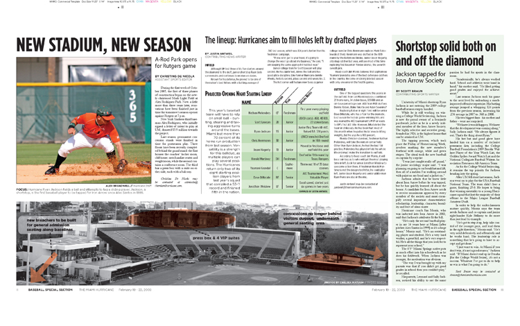 The Miami Hurricane Newspaper, February 2009, Coral Gables, Fl. Special Section: Baseball Doubletruck. Columbia Scholastic Press Association, Honorable Mention, Special Section Feature Package.